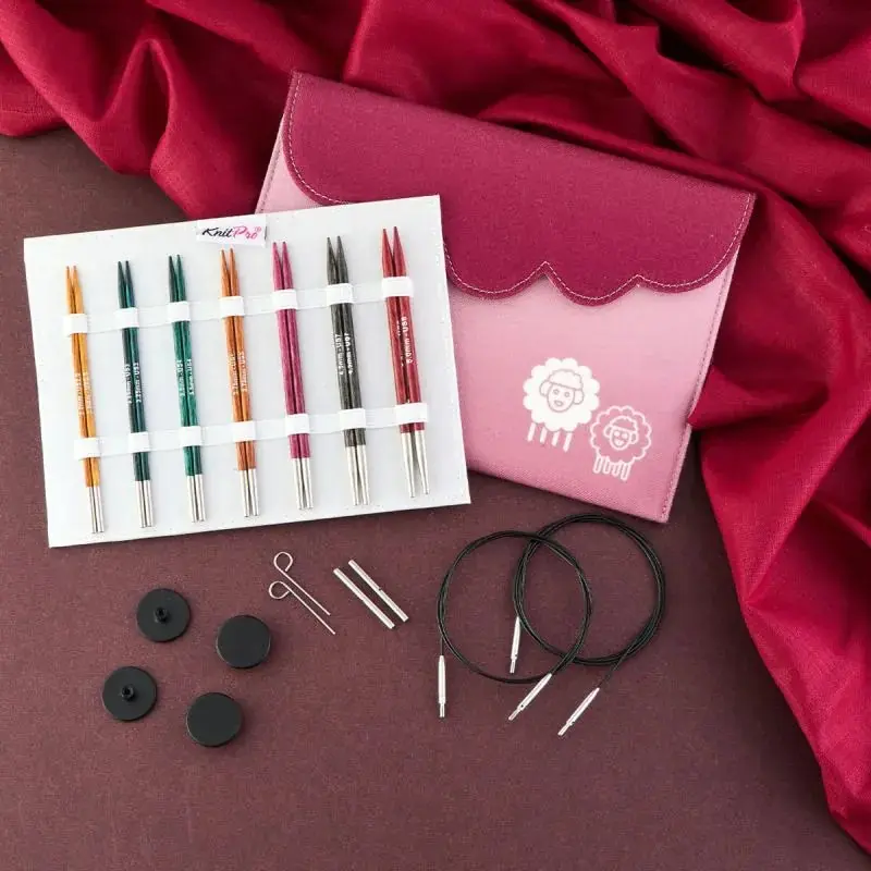 The Dreamz Needle Sets with 13cm (5") interchangeable circular knitting needles are thoughtfully designed with knitting comfort in mind. The smooth and lightweight interchangeable circular needle tips crafted from high-quality birchwood ensure effortless stitches and are color-coded according to size for easy identification. The smooth join does not snag, and the nylon-coated stainless-steel cables lie flat to prevent twisting. Whether you're a seasoned knitter or just starting out, these interchangeable circular needle sets packed in handy Bordeaux fabric cases provide the tools you need to create beautiful projects in complete comfort.