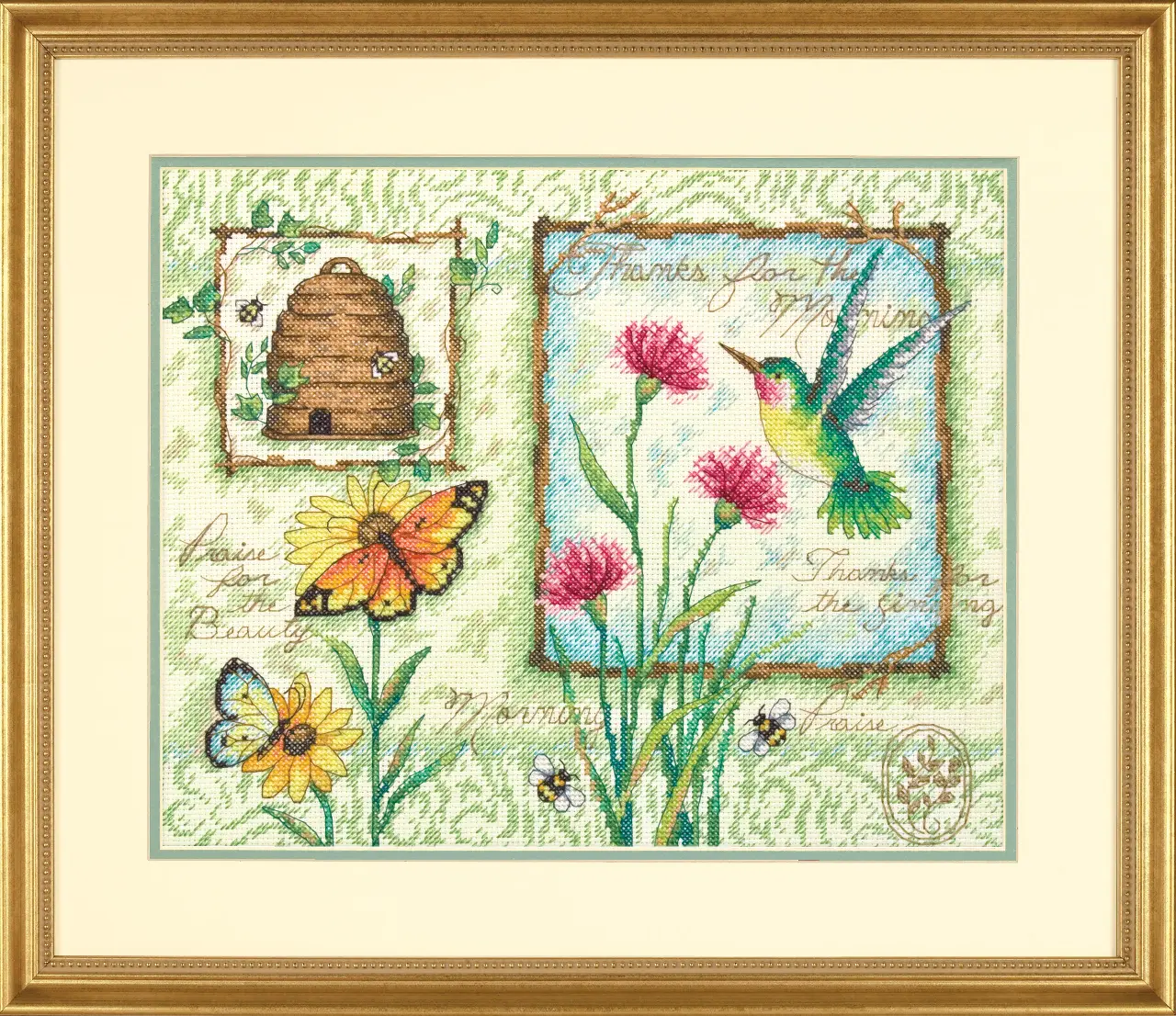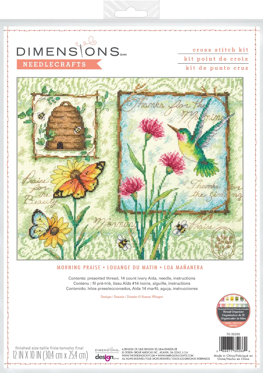 The set includes: ivory Aida 14 canvas, cotton mullet, needle, diagram, instructions.