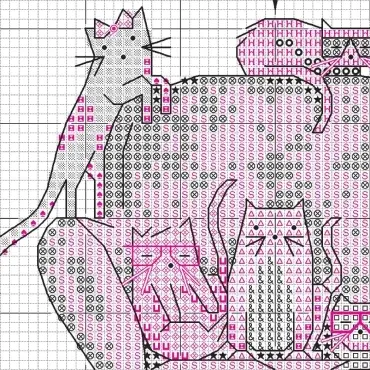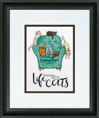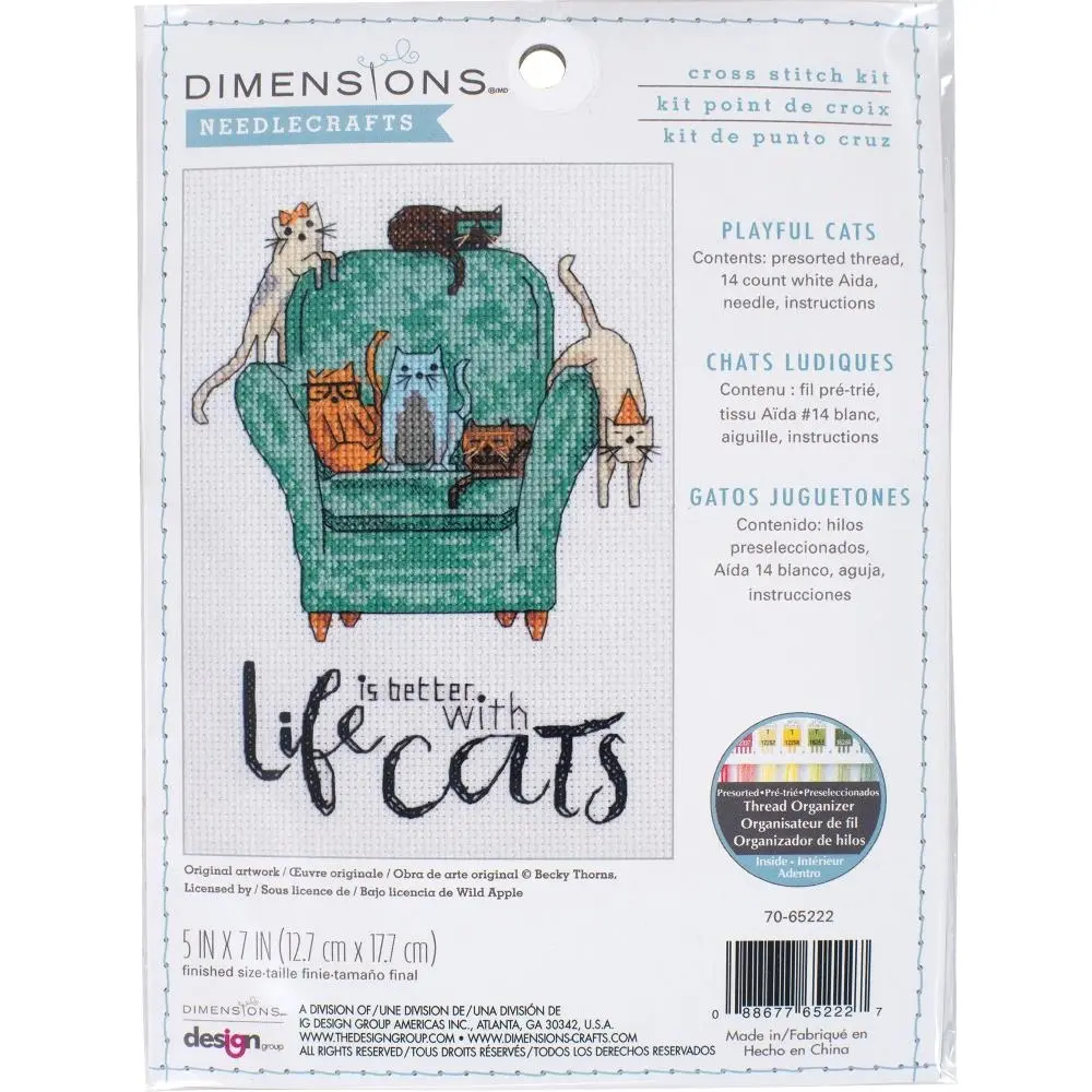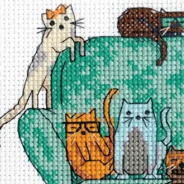 Composition of the set for cross-stitching the picture "Playful Cats \ Playful cats" 70-65222: Canvas for embroidery AIDA No. 14 white color, Mouliné, Diagram, Needle, Instructions. The size of the finished embroidery: 13x18 cm.
