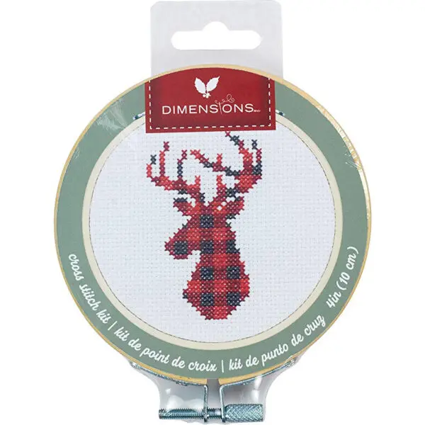 Includes 72-76048 Plaid Deer. dimensions. The kit for embroidery with threads includes: canvas Aida 14; branded floss threads - Dimension; wooden hoops; needle; color symbol scheme; instruction. Technique: counted cross. Size 10x10 cm