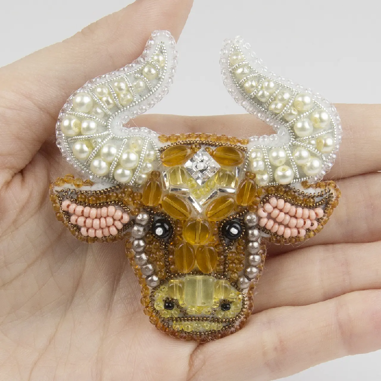 The kit contains: instruction chart, color pattern, Preciosa beads - 8 colors (4 sizes), Crystal Art beads - 7 colors (6 sizes), gimp, rhinestone, felt - 1 color, fastener and a needle.