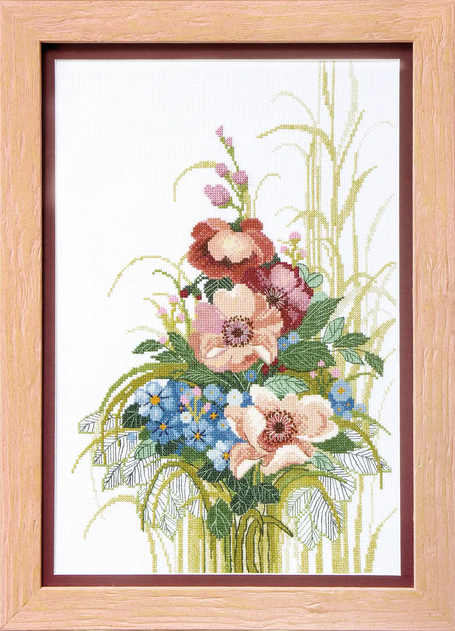 The work is stitched by cross stitch, semi-cross stitch, backstitch and French knot.