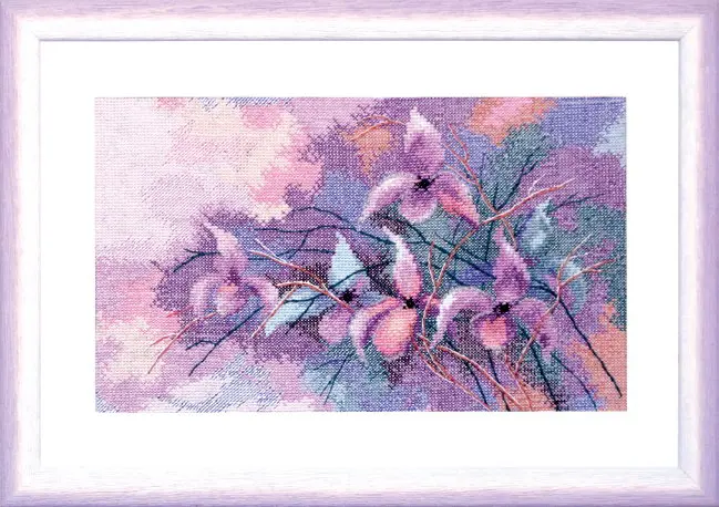 The kit contains: color cross stitch pattern, Aida 14, cotton embroidery threads and a needle.