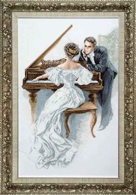 The kit contains: color cross stitch pattern, instruction chart, Aida 14 Zweigart, mouline Madeira – 33 colors, Preciosa beads of 3 colors and a needle.