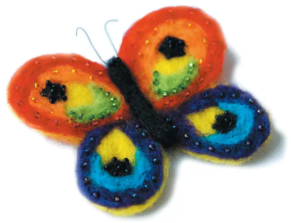 The kit contains: color pattern, instruction chart, Corriedale wool – 7 colors, felting needles – 2 pieces, beads for eyes, Preciosa beads – 4 colors, wire of black color (for mustache).