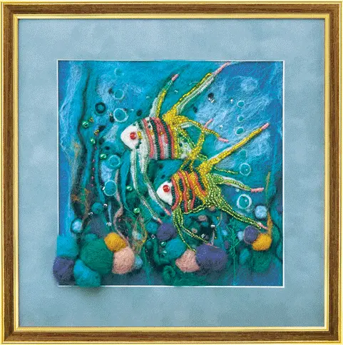 The kit contains: color pattern, instruction chart, Corriedale wool - 8 colors, felting needles – 2 pieces, Preciosa beads - 7 colors, cotton embroidery threads - 2 colors, felt (basis).