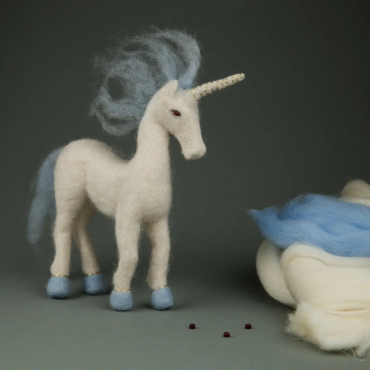 The kit contains: color pattern, instruction chart, Corriedale wool – 2 colors, felting needles – 2 pieces, metallized mouline, Preciosa beads –1 color.