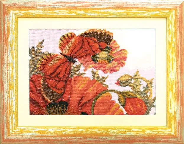 The kit contains: color cross stitch pattern, instruction chart, Aida 14, cotton embroidery threads and needles.