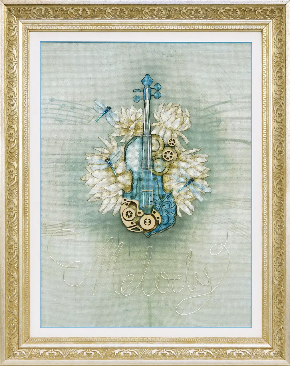 The kit contains: instruction chart, color cross stitch pattern, printed embroidery cloth, mouline Madeira - 21 color, Preciosa beads - 4 colors, plywood blanks, wire - 2 colors and a needles.