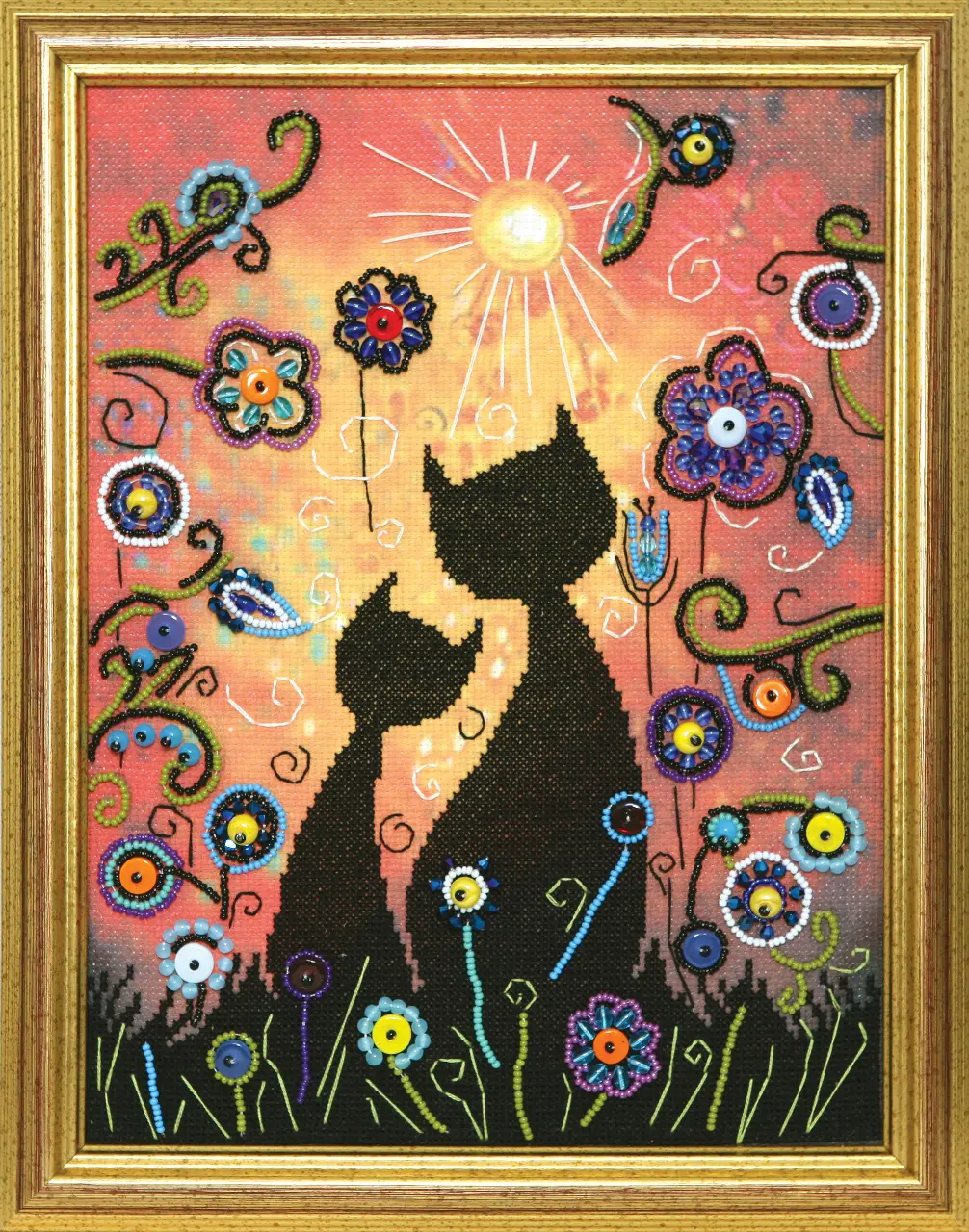 The kit contains: instruction chart, color cross stitch pattern, printed embroidery cloth, mouline Madeira - 3 colors, Preciosa beads - 9 colors, Crystal Art - 13 colors and needles.