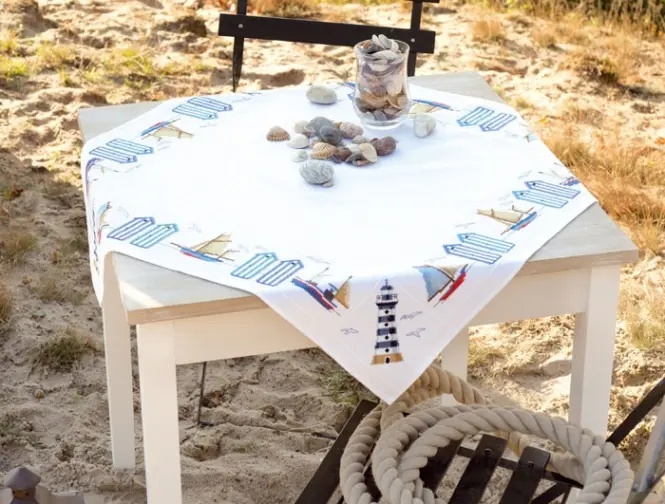 The kit contains: instruction chart, symbol pattern, uniweave cloth with pieces of canvas Aida 11 (white), cotton mouline DMC - 18 colors and a needle.