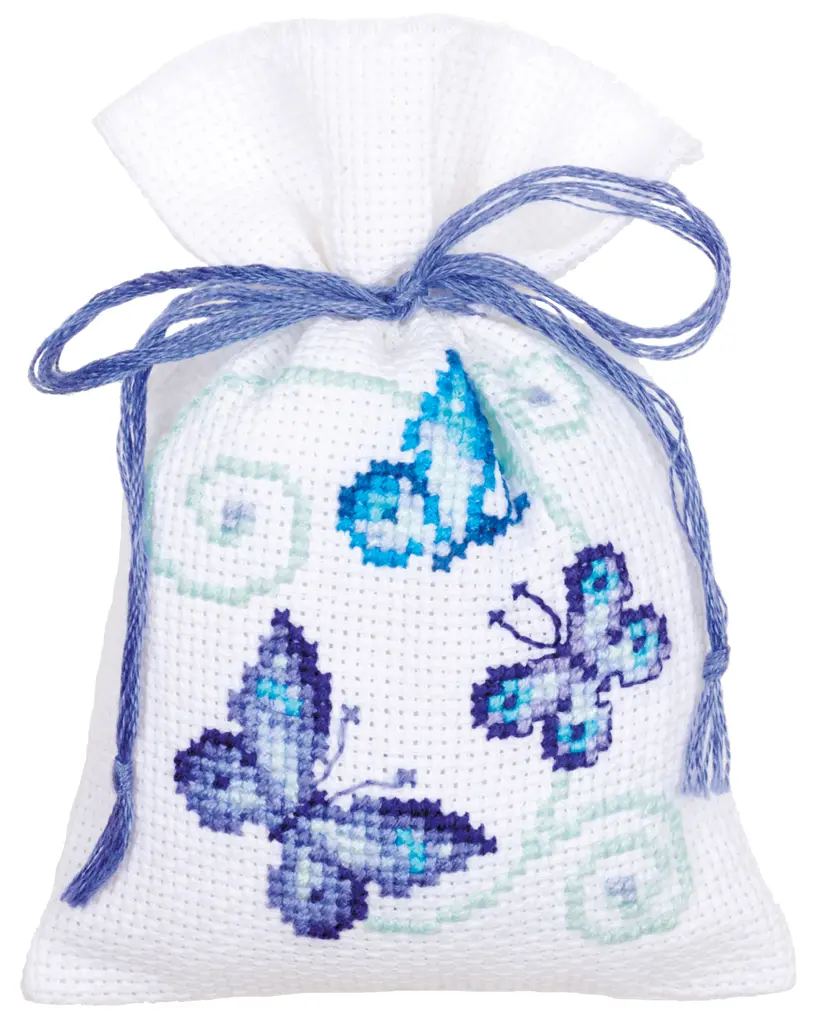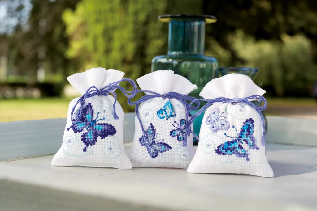 PN-0146430 Набор для вышивания крестом (мешочек) Vervaco Blue Butterflies Bags, 3 по 8х12, аида 18.. Catalog. Kits
