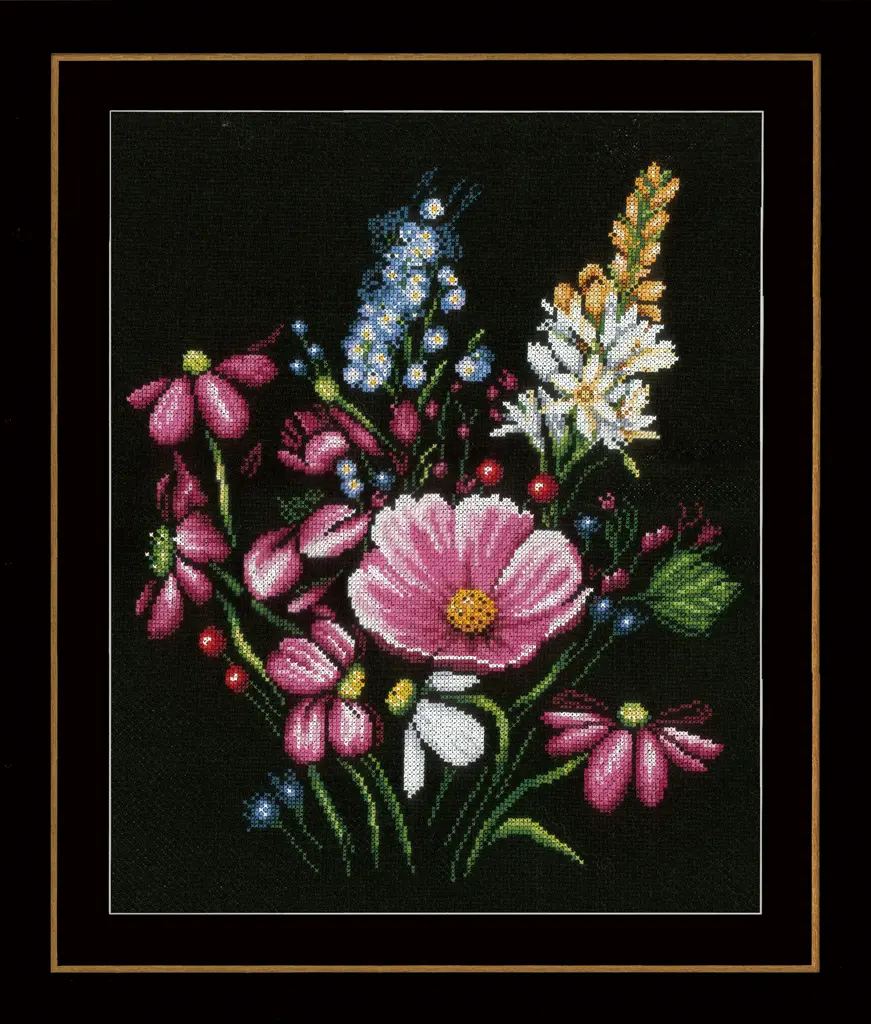 The kit contains: instruction chart, symbol pattern, Aida 14 (black), cotton mouline DMC - 33 colors and a needle.