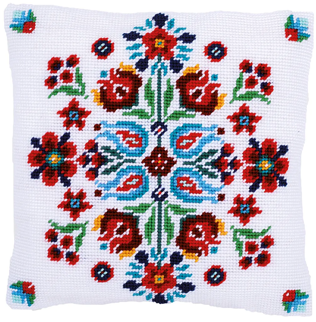The kit contains: instruction chart, stramin with printed picture (26ct./10cm), acrylic threads - 9 colors and a needle.
