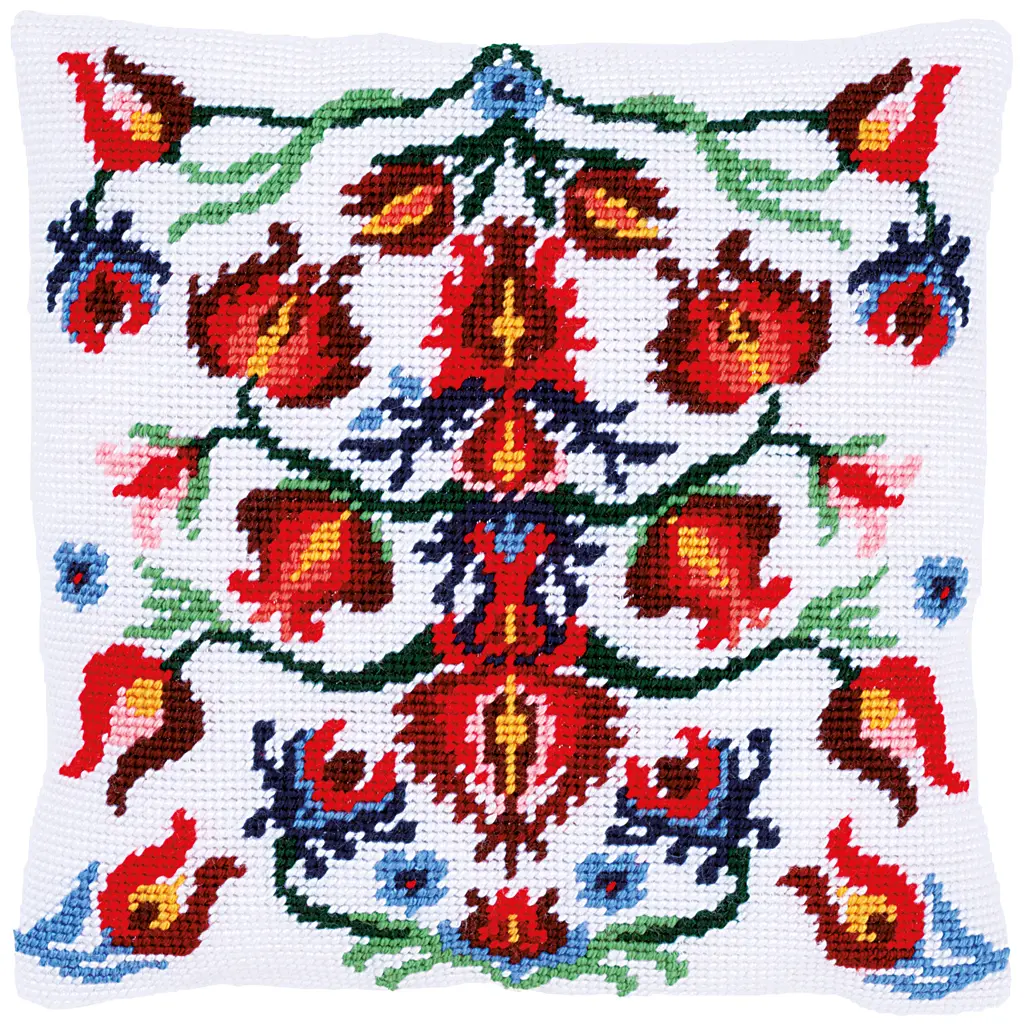 The kit contains: instruction chart, stramin with printed picture (26ct./10cm), acrylic threads - 11 colors and a needle.