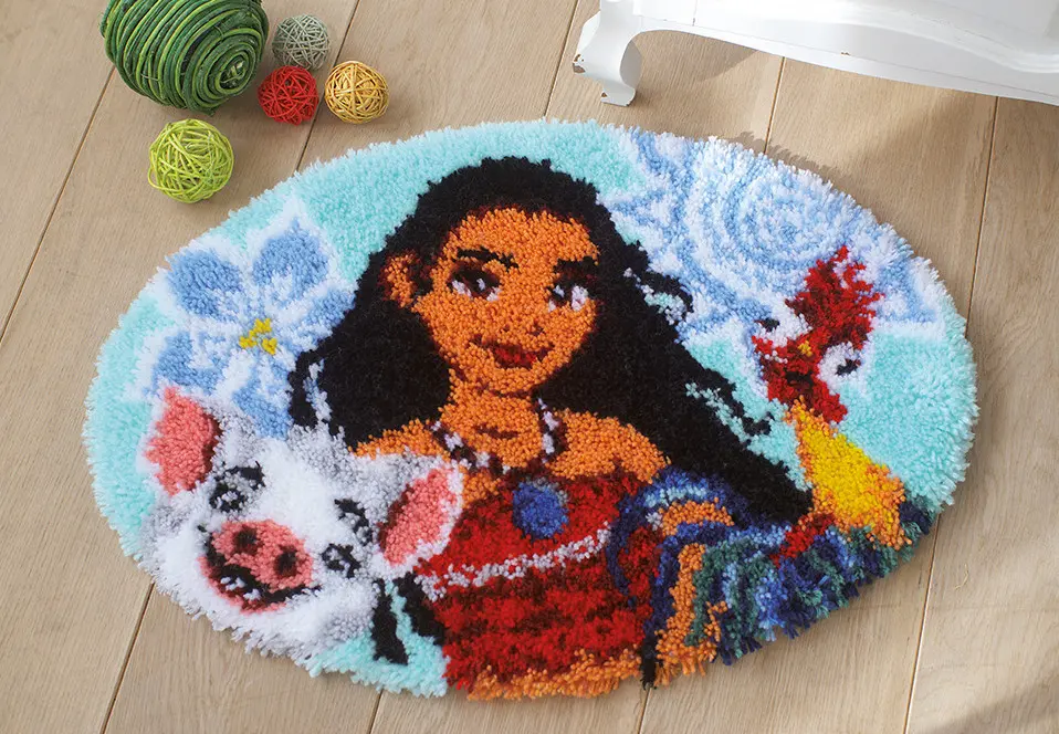 The kit contains: instruction chart, stramin with printed picture (52% cotton, 48% polyester), acrylic threads - 12 colors, ribbon and a crotchet.