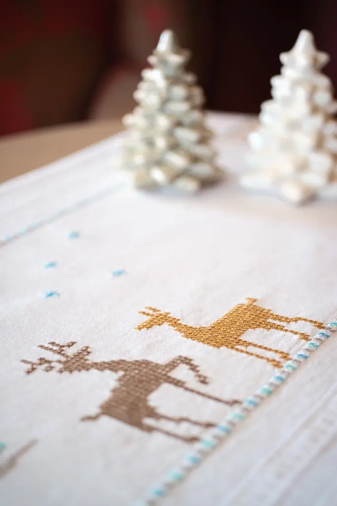The kit includes: instructions, symbolic black and white chart, embroidery fabric (white) with a printed pattern (washable), DMC cotton floss and a needle.