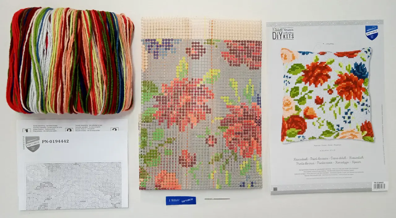 The kit contains: instruction chart, stramin with printed picture (18ct/10cm), acrylic threads - 13 colors and a needle.